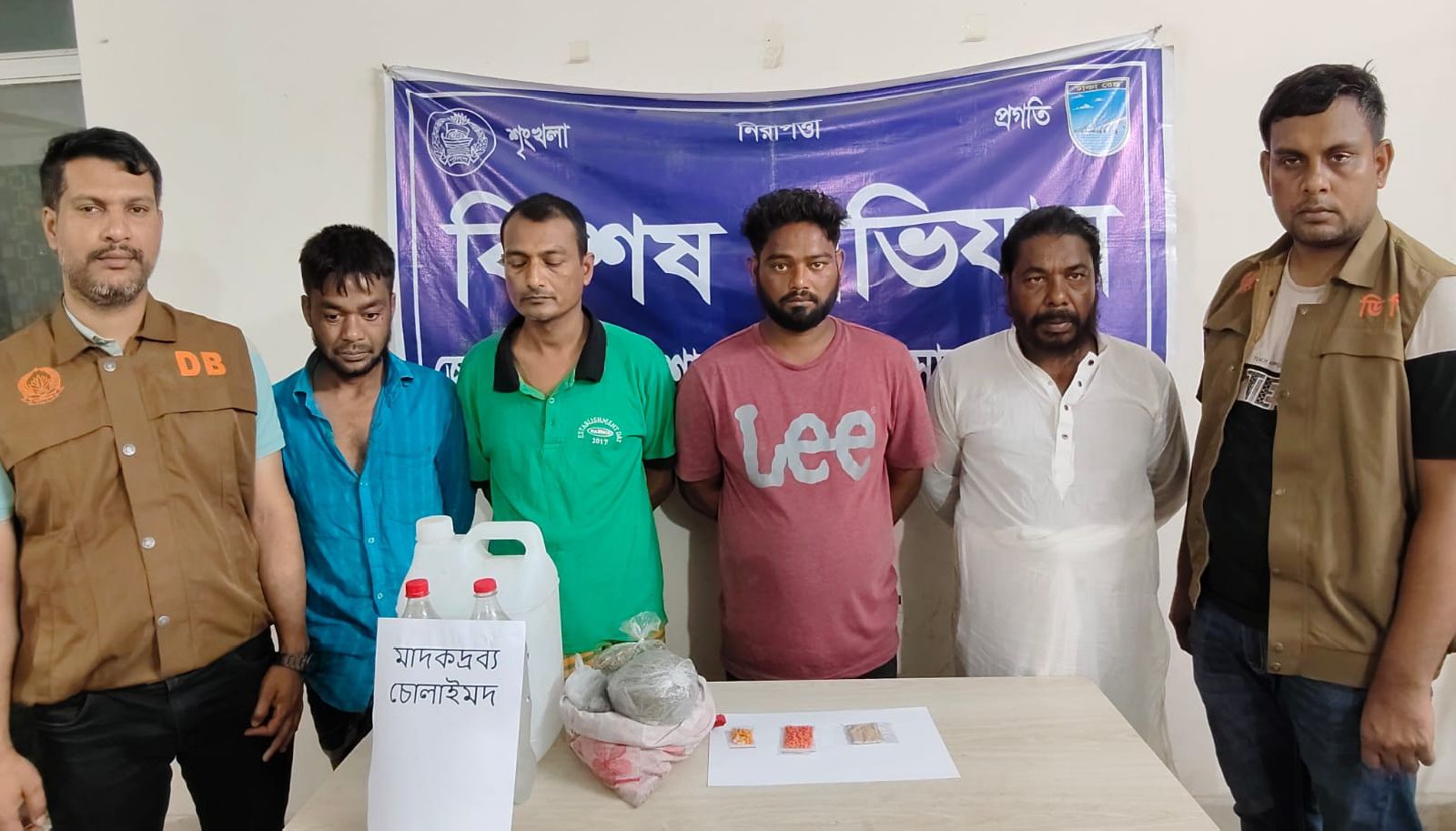 গ্রেফতারকৃত ও পলাতক আসামিদের বিরুদ্ধে সংশ্লিষ্ট থানায় মাদকদ্রব্য নিয়ন্ত্রণ আইনে মামলা দায়ের করা হয়েছে এবং গ্রেফতারকৃতদের আদালতে প্রেরণ করা হয়েছে।
